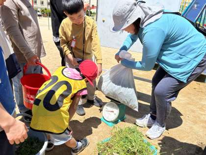 優勝は、緑チーム。重さは1.58kgでした。どのチームも協力し、雑草を入れるバケツがいっぱいになるくらい抜きました。みんなががんばったので、雑草でいっぱいだった学習園もスッキリ♪土が見えてきました♪
