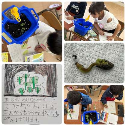 たくさんの子が「先生〜、あさがおの芽が出てるよ〜!」と笑顔で報告してくれました。