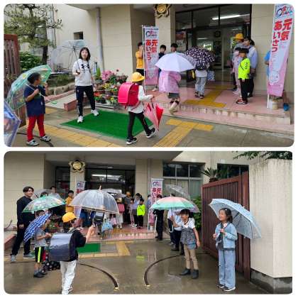 月曜日の今朝は、1年生と6年生が当番でした。あいにくの雨でしたが、朝から元気よく「おはようございます!」とあいさつができました。