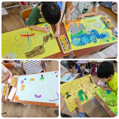 にょろにょろ、ぼこぼこした長い長い線を描き、描いた線からいろんな冒険の物語を考えていきます。想像力たくましい子ども達は、「これ、○○のぼうけんやねん」と話をしながら、途中に家を作ったり、虹色の橋をかけたりしています。