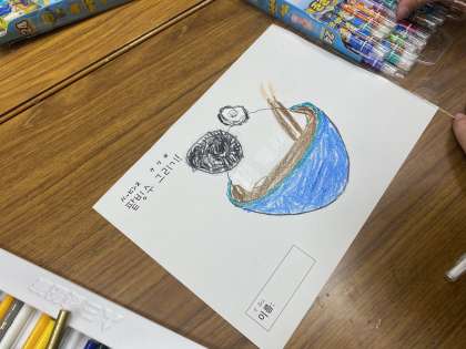 韓国の有名なピンスの写真を参考に、自分の好きな食べ物がのったピンスや、食べてみたいピンスを描きました。前回の学びを活かしながら、楽しく活動していました。
