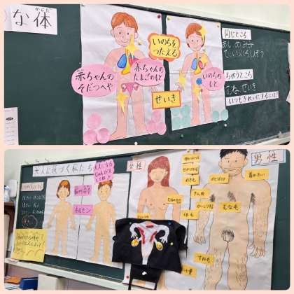 低学年は、男の子と女の子の体の違いと性器の役割について、みんなで話し合いをしました。また、大切な体をいつもきれいにする方法についても考えました。みんな真剣に考え、1人1回は自分の考えを発表しました。学習を通して、自分の体の大切さについて改めて考えることができました。