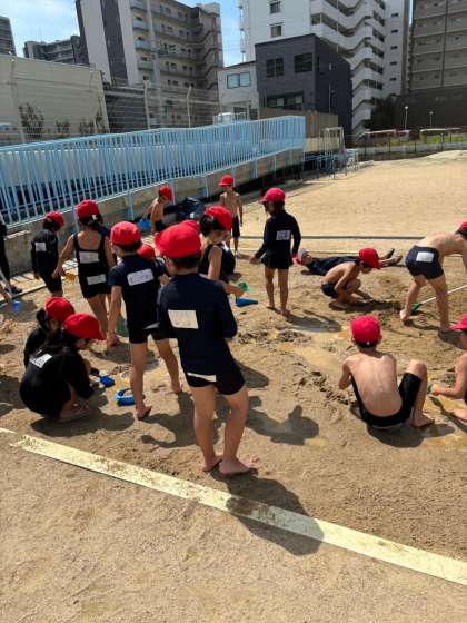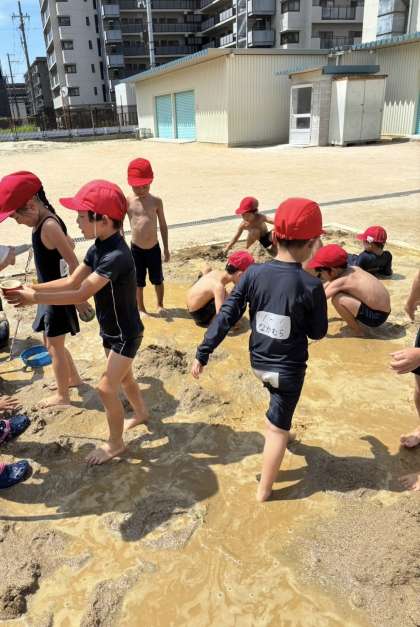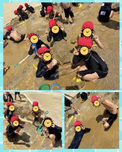 最後は1組です。やっと天気に恵まれ、1学期の最終日にはなりましたが、無事実施することができました。泥の感触を全身で味わい、友だちと楽しく活動していました。