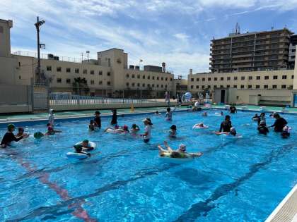 高学年と卒業生は、プールで水遊びをしました。最初に、2つのチームに分かれて水中リレーや宝探しゲームをして、違う学年のお友だちや中学生と交流をしました。交流のあとは、自分たちが持ってきた浮き輪やビーチボール、水鉄砲を使って自由に遊びました。たくさんの先生方にも来ていただき、違う学年のお友だちや先生方ととても楽しい時間を過ごすことができました。