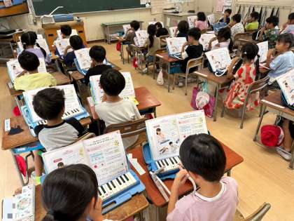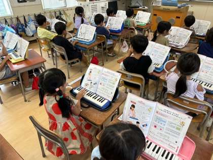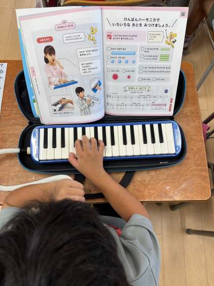 先日よりけんばんハーモニカの学習が始まりました。保育所や幼稚園などで扱ったことのある子もいますが、まずは基本の正しい姿勢・音の出し方・指の使い方を学んでいるところです。