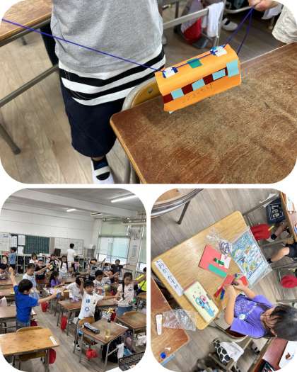 先日より図工の学習で「スルスルビューン」を学習しています。子どもたちが自分でアイデアを出しながら、「鳥みたいにしよう!」「乗り物みたいにしよう!」と楽しみながら活動していました。