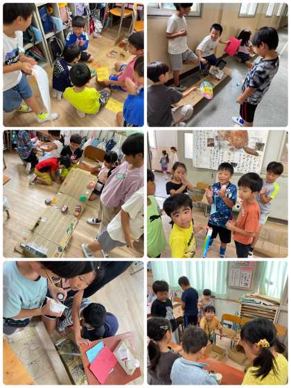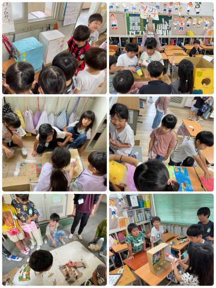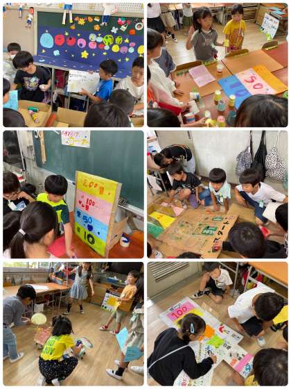 今日は、1年生を招待して、おもちゃランドを開催しました。1学期の生活の時間に作ったおもちゃを、1年生が楽しく遊べるように改良して準備をしてきました。