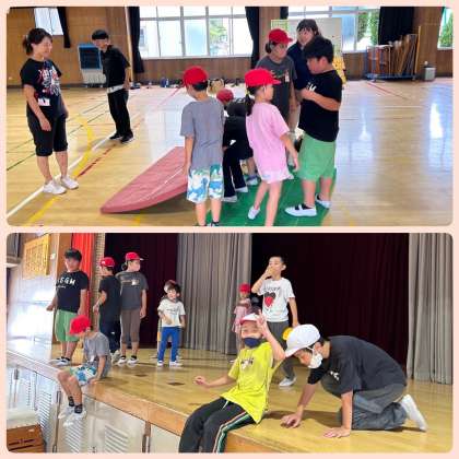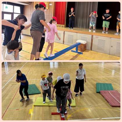 3つ目は、島わたりというゲームをしました。グループで協力して目的地である宝島を目指しました。ルールは、「各チームに2枚のマットを使って、マットから落ちないように目的地に行く」のみ伝えられた後、3分間の作戦タイムで話し合いをしました。スタートすると、「いっせーのーでぇ!!」と声をそろえて、マットを持ち上げて移動したり、マットを回転させたりと、チームごとに作戦が違っていました。最後は、どちらのチームも仲間と協力して目的地に到達することができました。