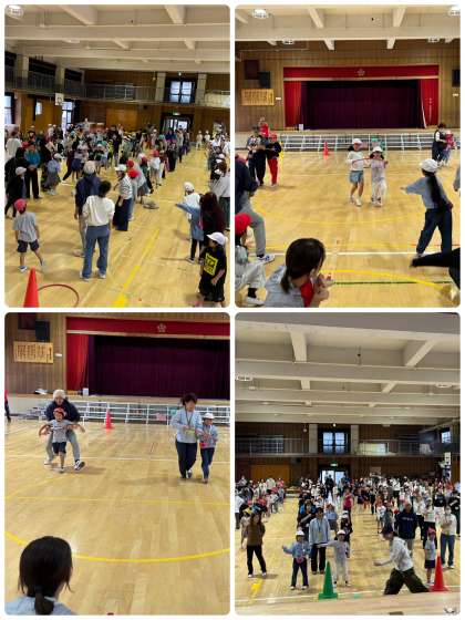 2種目目は、フープリレー!!フープの中に二人で入ってリレーをしました。二人でフープに入ると、走りづらいですが、走り方ややらび方を工夫して上手に走っていました。とても盛り上がりました。
