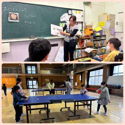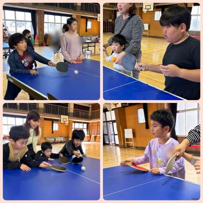 今回のなかよしタイムは、卓球とサウンドテーブルテニスをしました。子どもたちにとって、初めての卓球だったので卓球をすることがわかると、みんなワクワクしていました。また卓球だけでなく、全国障がい者スポーツ大会の競技の1つであるサウンドテーブルテニスを簡単にしたものにも取り組みました。ラケットの扱いに苦戦していましたが、うまく打ち返すことができたときはとっても嬉しそうにしていました。
