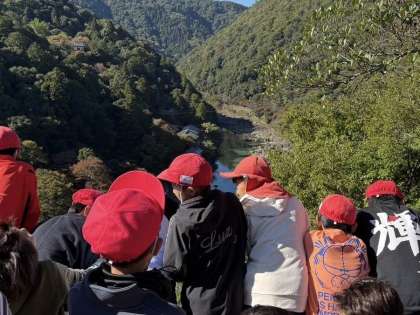昼食時には、トロッコ電車が通過するタイミングもあり、保津峡に向かって「ヤッホー!」と叫ぶ子どもたちが楽しそうな顔をしていました。
