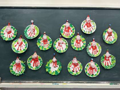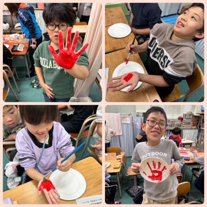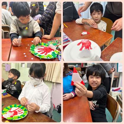 赤色の絵の具で手形を押すときは、絵の具の感触に「うぁー!!」と声をあげながら押していました。手の大きさや形が人それぞれ違うので、「1年生の手は小さくて可愛い♪」や「手形に線がたくさんある!」と手形を見ながら興味津々に話をしていました。折り紙でサンタクロースの形を折るときは、帽子の折り方や完成したあとに描いた顔の表情がそれぞれ違って良い味を出していました。最後は、緑と黄緑色の折り紙をちぎって紙皿の縁に貼り、その上にシールで飾り付けをしました。可愛いサンタクロースと飾りいっぱいの素敵なクリスマスリースが完成しました。