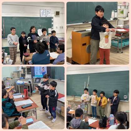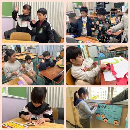なかよし学級の子どもたちは、来週行われるなかよし集会に向けて、準備や練習をしています。画用紙に集会の案内を書いたり、似顔絵の飾りを作ったりして、各学年の廊下に貼るポスターを作成しました。また、12月に入ると、各学級に手話の先生として、教えに行きました。どの学級の子どもたちもなかよし学級の子どもたちを見ながら一生懸命に取り組んでいました。なかよし学級の子どもたちは、教え終わったあとにたくさんの拍手を受け、本番に向けて自信をつけています。