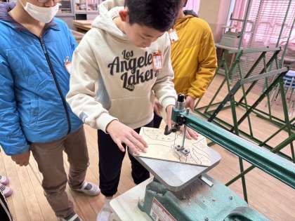 5年生の図画工作科では木材を電動糸のこぎりをつかって、木を切っていく作業をしています。高学年ともなると、様々な道具を使って立体作品を作っていきます。子どもたちは初めて電動糸のこぎりを使用するので、初めは緊張していた様子ですが、慣れてくると、スムーズに木を切ることができていました。