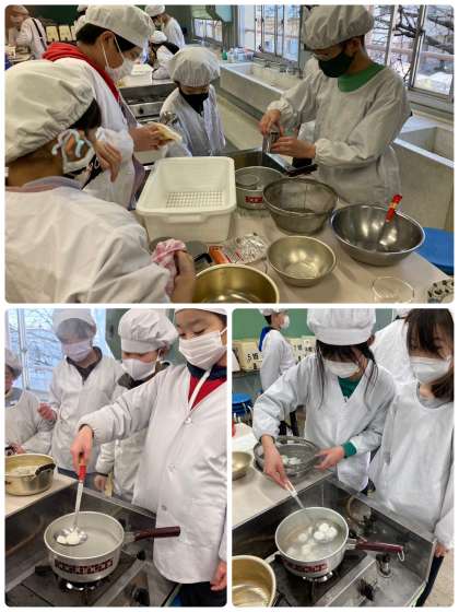 5年生最後の調理実習として、白玉団子を作りました。ほっと一息つける時間を作るために、お茶菓子を作るという学習です。和気あいあいと調理実習に臨み、班に行っては団子になっていない形のものもあったようですが、楽しく学習することができたようです。また食べるときには、楽しく会話しながら、そして、味わいながら、ほっと一息つける時間を過ごせたようです。5年生から始まった家庭科の学習も、いよいよまとめの段階となります。6年生への学びへとつないでいけたらと思います。
