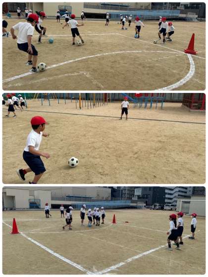 体育でボール蹴りあそびの学習をしており、今日は『たまごわりサッカー』をしました。