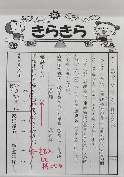 また、みにきらきらも、学校が終わったらどこへ行くのか(帰るのか)を記入して持たせてください。これとは別に、連絡帳も必要です。連絡事項が何もなくても、毎日持たせてください。