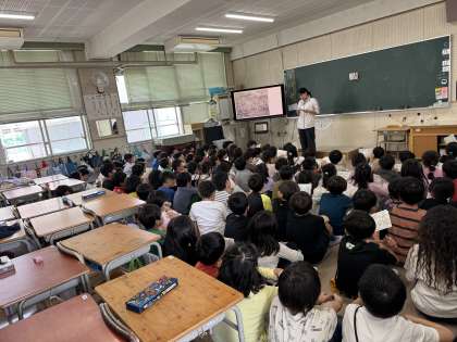 来週実施する遠足の説明を2年生全体でしました。服部緑地公園までの道のりや持ち物、草木の観察などの話を一生懸命聞いていました。当日は、暑くなることが予想されます。ハンカチやタオルを持ってくる、500mLのペットボトルを余分に持ってくるなど、熱中症対策もお願いします。しおりを持ち帰っていますので、ご準備ください。