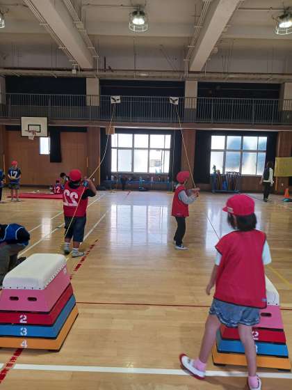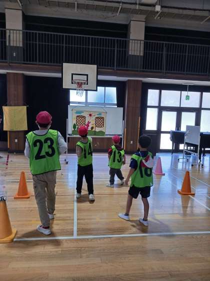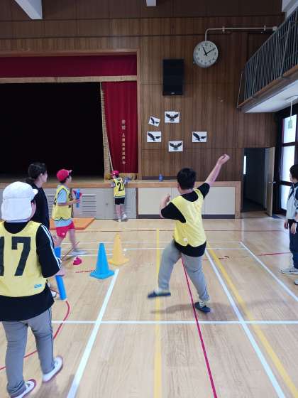 本日のなかよしタイムは、ソフトボール投げのレベルアップにつながる体育あそびでした。ソフトボール的当て・ロケット飛ばし・バトンスロー・マジックボール的当て・紙鉄砲のコーナーをチームで順番に回りました。うまくいかなかった時に上手なメンバーからコツを教えてもらったり、高得点を狙う秘策を思いついて共有したり、みんな楽しく参加しました。