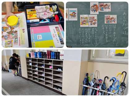 学校生活は大勢が一緒に過ごすので、整理整頓を心がけないと、けがにつながることもあります。1年生では、傘の入れ方や靴の並べ方など、整理整頓が習慣として身につくように日々声かけをしています。