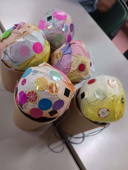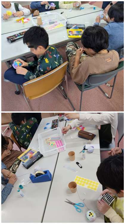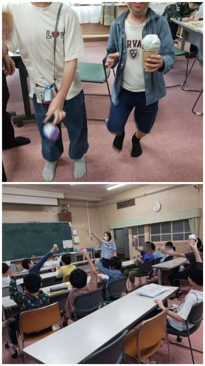 本日のなかよしタイムは、アイスクリームけん玉の製作でした。両面テープと折り紙を使って、カプセルでアイスクリームを作り、シールでトッピングをしました。細かな作業も多かったですが、アイスクリームの歌にのりながら、美味しそうなアイスクリームけん玉が完成しました。けん玉を成功させるのはなかなかむずかしく、みんな何度も挑戦したり、上手な子にコツを教えてもらったりしていました。最後はみんなで乾杯してフィナーレでした!