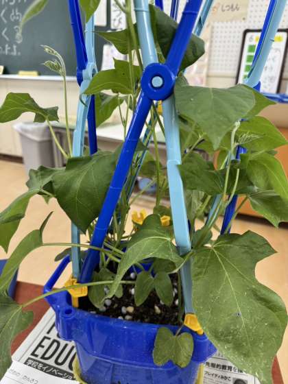 5月に植えたあさがおがぐんぐん育ってきました。子どもたちは、毎日水をやったり、観察したりして花が咲くのを楽しみにしています。