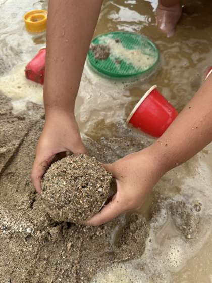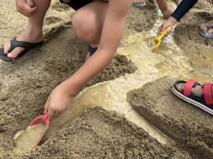 バシャバシャと音を立てて、砂や水の中に入り、楽しく活動しました。水を流しながら、「つなげよう!」「いいよ!」と言って道を作ってつなげていき、砂場が町のようになっていきました。