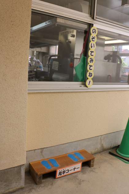 給食室で給食を作っている様子をもっと子どもたちに見てもらうために、見学コーナーを設置しました。低学年の子がよく見やすいように、見学台も管理作業員さんに作っていただきました。調理員さんによると、のぞいているのは意外と高学年の子が多いそうです。