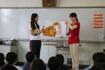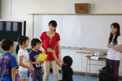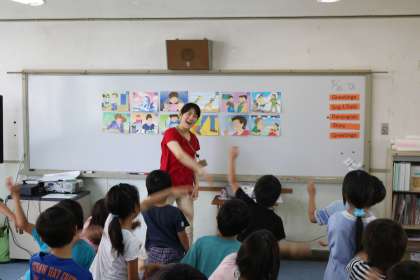 外国語活動の時間は日本語なし! 身振り手ぶり、表情や絵などによって聞こえてきた英語の言葉を体で受け止めます。子どもたちは、わからないことや間違えることにおそれず、新しい情報を楽しみに変える力があります。この素晴らしい子どもの力を生かして、コミュニケーション能力を育みたいと考えています。