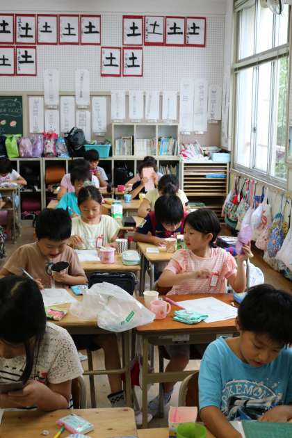 6月28日(火)歯垢の染め出しをしました。歯垢が残っていると薬が濃く反応するのでどの部分に歯の磨き残しがあるのかよくわかります。多くの児童は、歯と歯茎の間、奥歯の磨き残しが見られました。鏡を見ながら歯垢が取れるような歯の磨き方をあれこれと試しました。これから、このことを意識しながら磨くことができるといいですね。