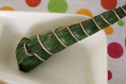 給食のちまきの原材料は上新粉、砂糖、でんぷん、もち米、食塩(原材料の一部に小麦を含む)です。蒸して作ったもちを円錐形に成型にして笹で巻き、い草でぐるぐる巻きに手作業でしばって作られたものが学校に届きます。関西ではちまきが、関東では柏餅がこどもの日に食べられることが多いようです。