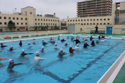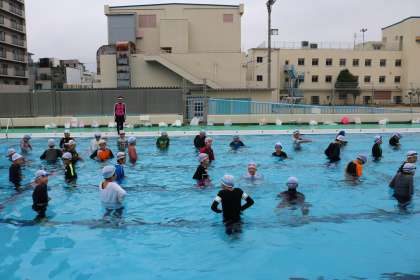 まずは持参したジャージなどを着たまま入水させ体を動かします。実際に泳いだり、ペットボトルを投げ入れて浮き続けたりすることなどに挑戦したりしました。水を含んだ着衣は重く、いつもとかってが違うので四苦八苦していました。