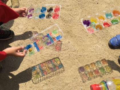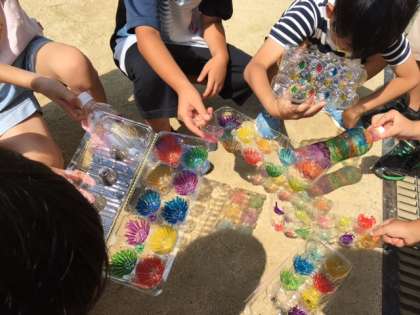 2年生では、図工科の学習で「ひかりのプレゼント」をしました。子どもたちがお家から持ってきた、たまごパックやペットボトルにカラーペンでカラフルに色を塗りました。太陽の光を当ててみると…地面に色鮮やかな影が映しだされました。子どもたちからは「わぁ〜きれい!」「すごいね!」などの歓声があがりました。