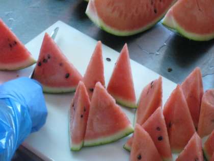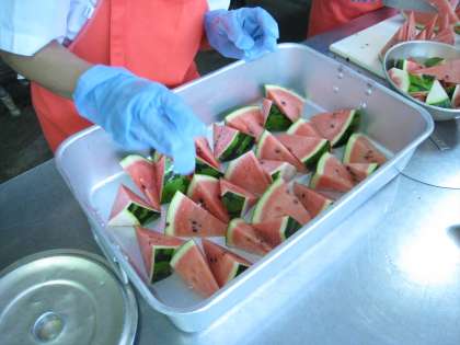 7月14日の給食のデザートにすいかが登場しました。すいか1玉を64人分に切り分けます。給食では1年に1回しか登場しないおかずや果物があるのですが、すいかもその一つです。