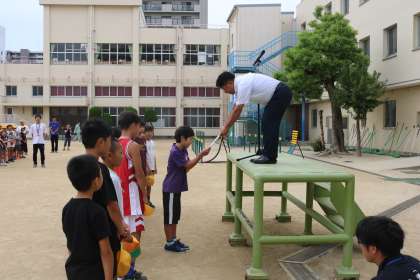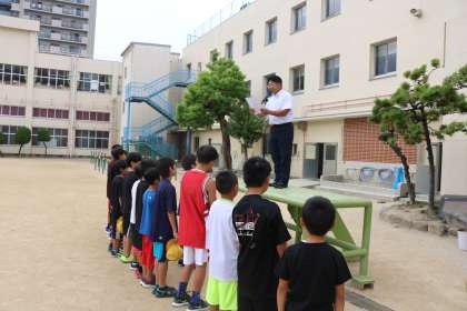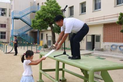 2学期の朝会も、はや2回目です。朝会では体育委員がラジオ体操を行い、校長先生や担当の先生からお話を聞きます。今日は版画での表彰とミニバス男子がブロック3位になった表彰状を紹介していました。