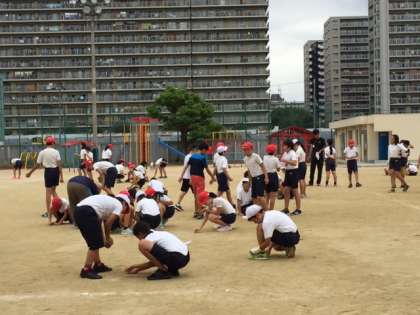 ここ2週間は、朝会や業間を使って、石拾いをしています。各学年が割り振られた場所をきれいにし、はだしでの演技を安全にできるようにしています。