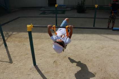 2枚目 鉄棒コーナー 鉄棒練習用ベルトを使って活動することができます。
