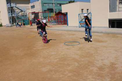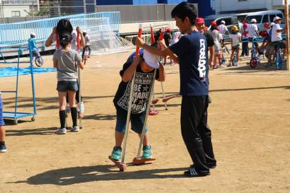 25日(月)は5,6年の三国っ子タイムがモジュールの時間に行われました。高学年になると一輪車に乗れる児童も数人おり、写真のように8の字まわりをしたりフラフープの周りをくるくると回ったりすることもできていました。