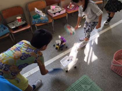 10月10日火曜日の5時間目に2年生が「おもちゃランド」を開き1年生を招待しました。この日までに2年生は、手作りおもちゃを作成し、グループで遊び方やルールを話し合いました。1年生に楽しんでもらえるように工夫もしました。今日は、上級生らしくアドバイスをする姿も見られた2年生。1年生も喜んでくれたようです。