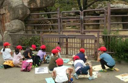 動物園では写生に挑戦です。グループに分かれ、動物の形をよく見ながら画面いっぱいに描きました。そばを通るたくさんの人々に「上手だね。」と声をかけていただきました。