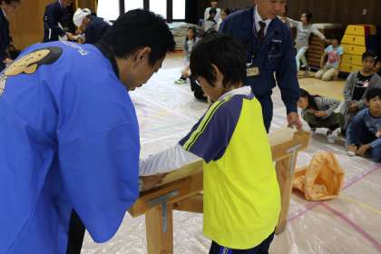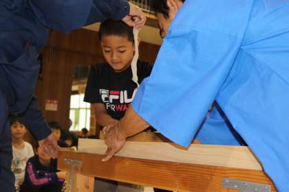 二、三枚目 かんなで木を削っている場面(全員削りました)