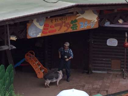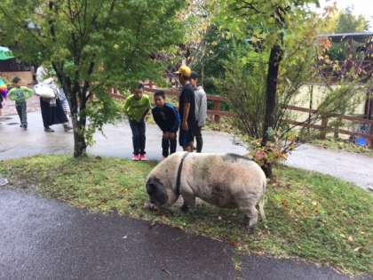 ソーセージ作りは大変手際よく行われたようで、少し時間が余ったようです。その時間で散策をしたり、少しだけミニブタ芸を見たりしてから宗陶苑に向かいました。