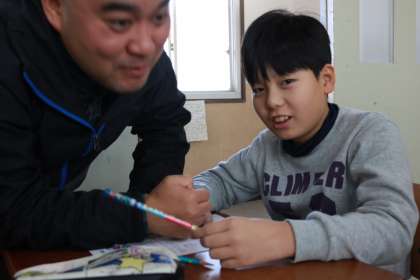 1組では、筆ペンの使い方に苦戦しながらも筆ペンで短歌を視写していました。