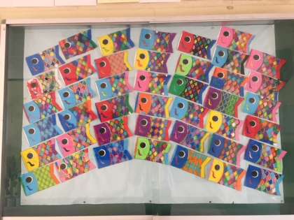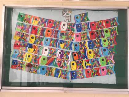 三国小学校の玄関には、2年生の子ども達が思い思いに色を塗ったこいのぼりが飾られています。