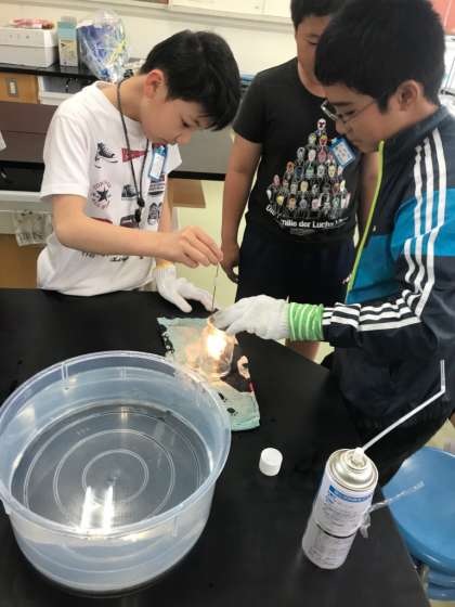 6年生の理科の最初の学習は「ものの燃え方」です。安全に気をつけて実験を行っています。気体検知管や石灰水、新しい器具や薬品も使い、グループで協力しながら取り組んでいます。