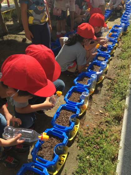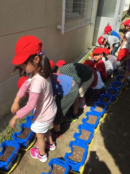 元気いっぱいの1年生。今日は「あさがおのたね」を撒きました。「たねは、丸い形や三角の形をしているね。」「たねは黒色だね。」など、あさがおのたねを撒く前に、子どもたちはじっくり観察することができました。子どもたちは綺麗な花を咲かせたいという希望を胸に水やりをしていました。
