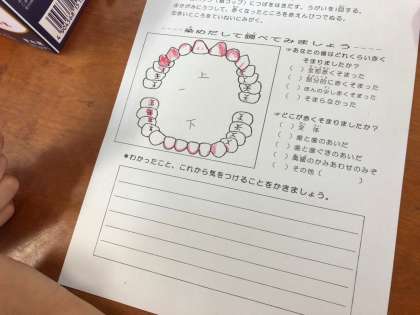 歯垢染め出しをしました。「全然染まらなかったらいいな。」と言っていた子どもたちも、染め出しを行うと歯がピンク色に染まりびっくり!自分の歯で磨けていないところをスケッチし、手鏡を見ながら歯を磨きました。「3分ぐらい磨いてたらええんかな?」「磨きにくいとこがあるな。」と日ごろの歯磨きを見直す機会になりました。