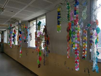 色紙をいろんな形に切ったり折ったりして、とりどりの飾りを作りました。