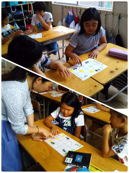 昼休みは、韓国のボードゲーム「ホバッコム」で遊びました。自分のコマ3つをマスに動かして、相手が動けなくなったら勝ちです。頭を使うゲームに、子ども達も夢中でした。