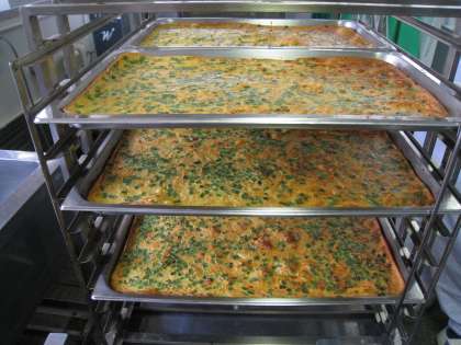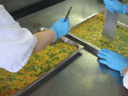 7月13日(金)の給食に、チヂミが登場しました。韓国・朝鮮では地元の食材を生かしたいろいろな種類のチヂミがあります。給食では、小麦粉、卵、水、塩をあわせた中に、にら、にんじんを混ぜて焼きます。焼き上がったチヂミは、調理員さんが切り分けて各学級に配缶しています。児童に好評なおかずです。